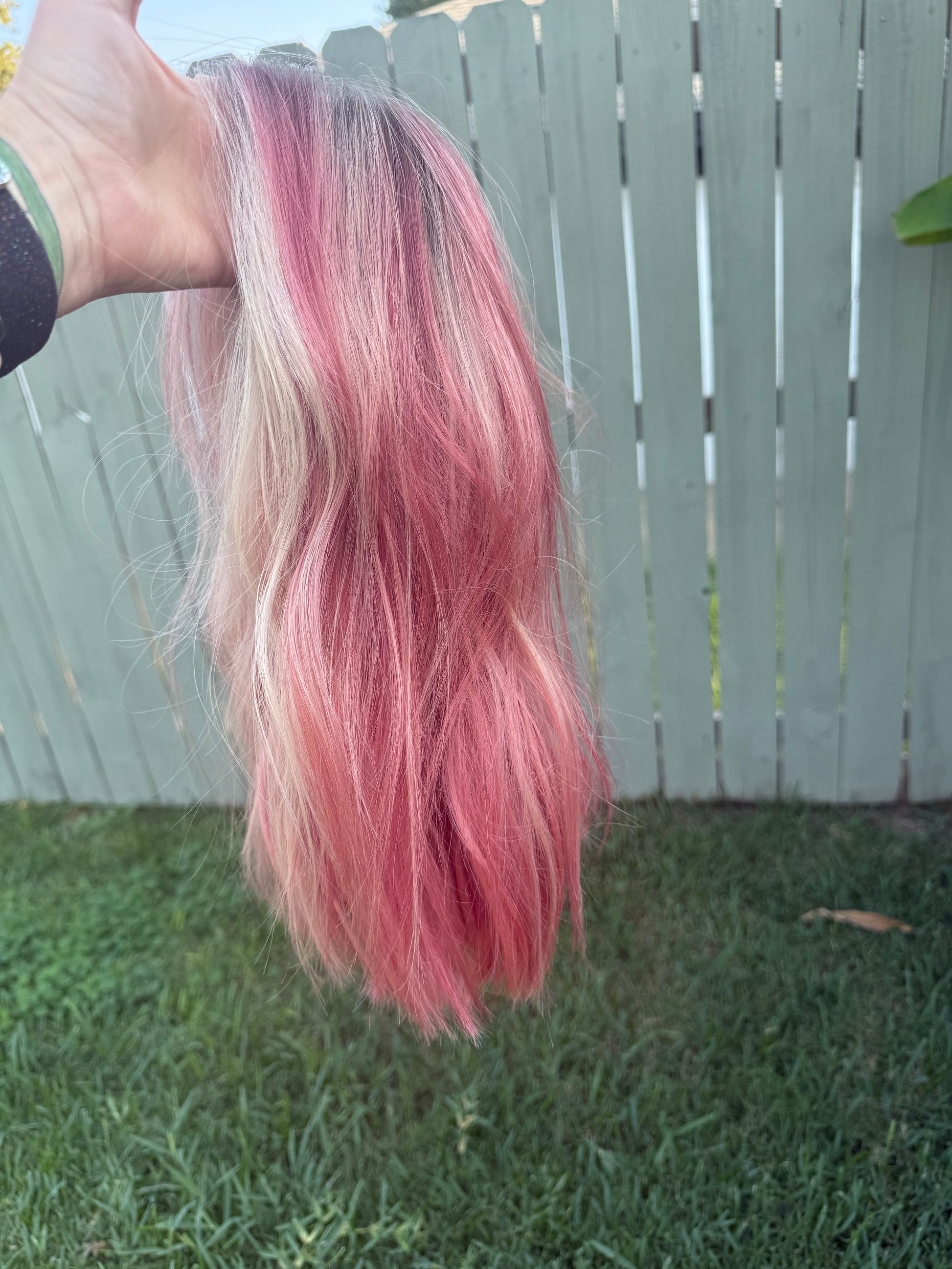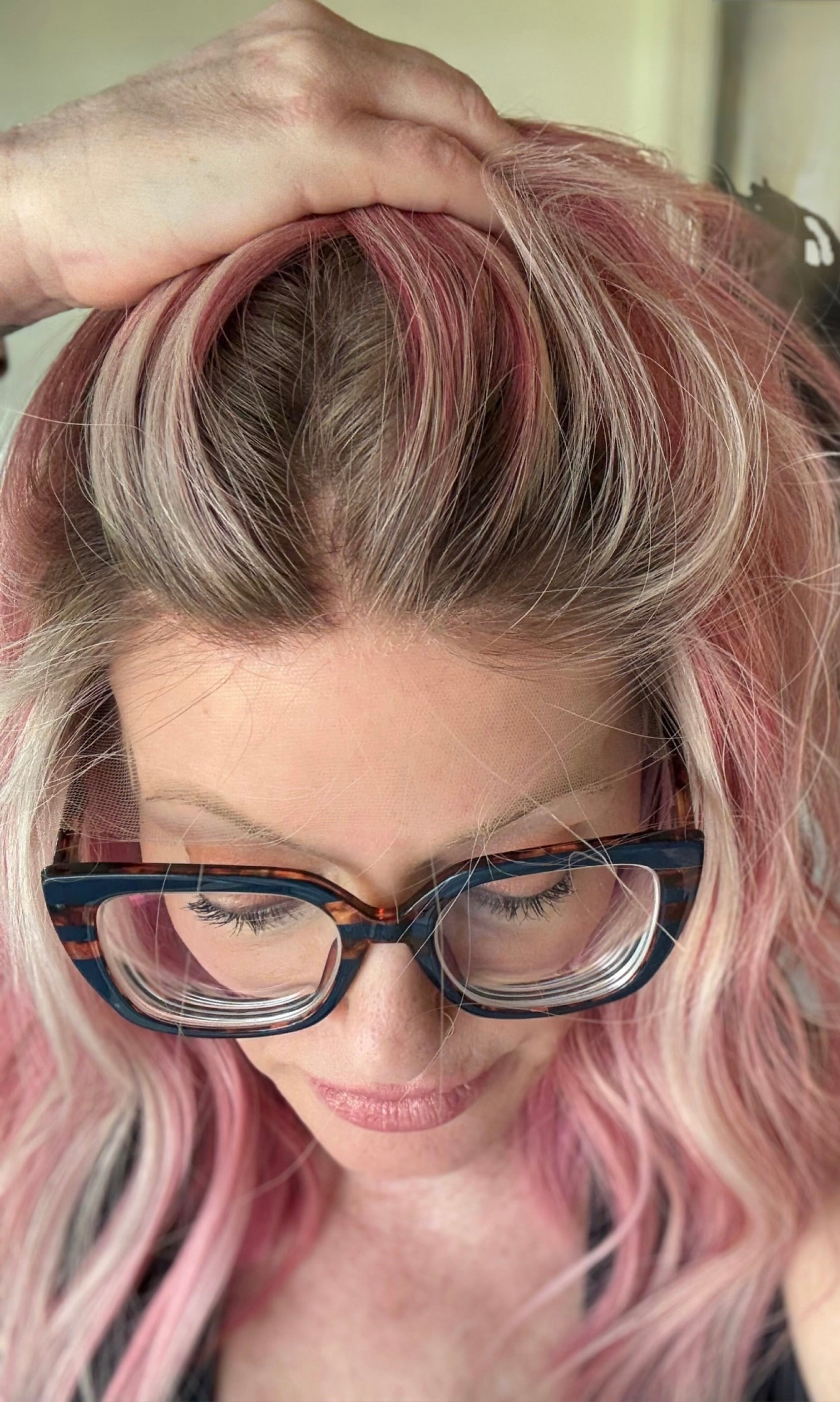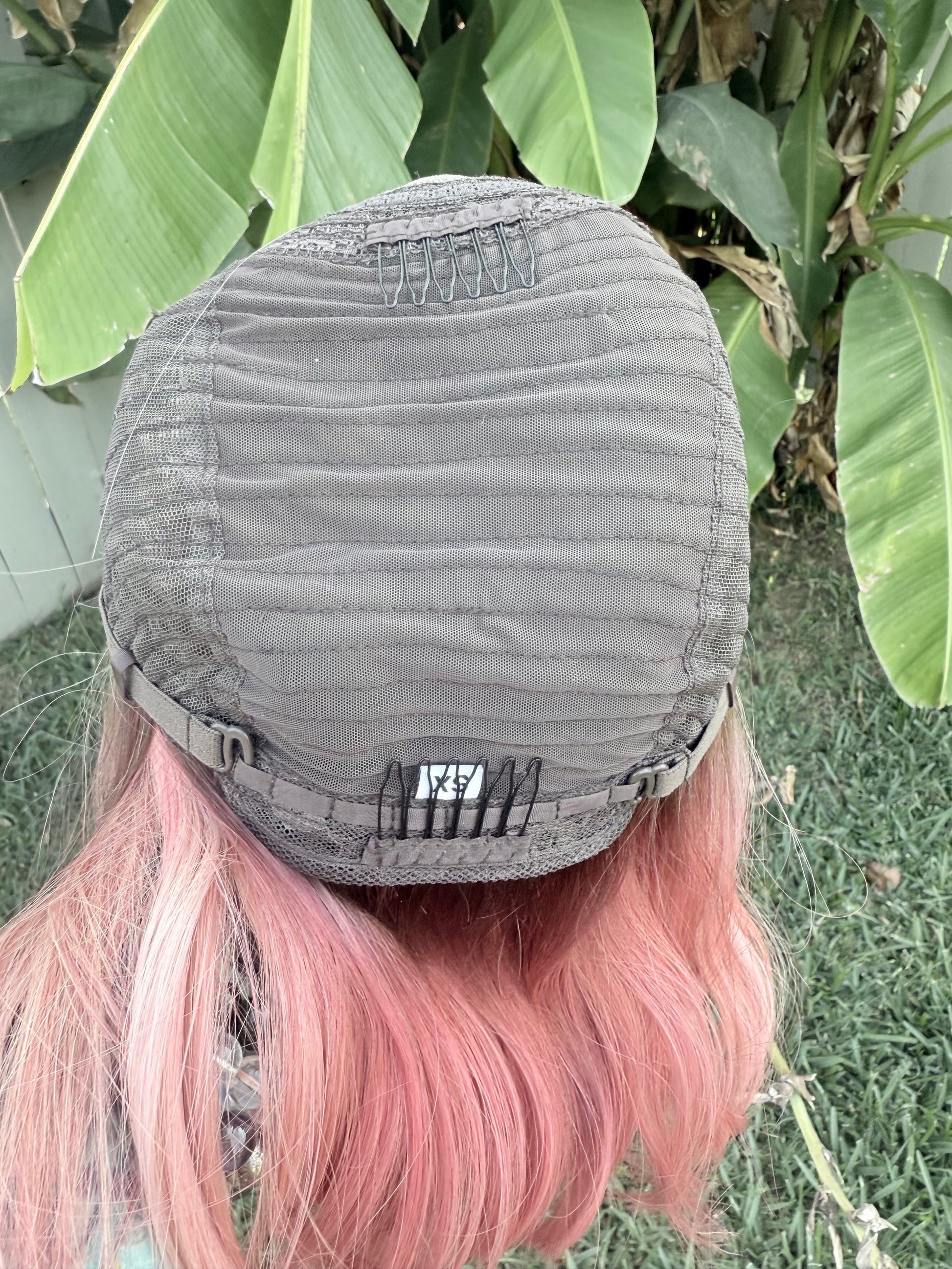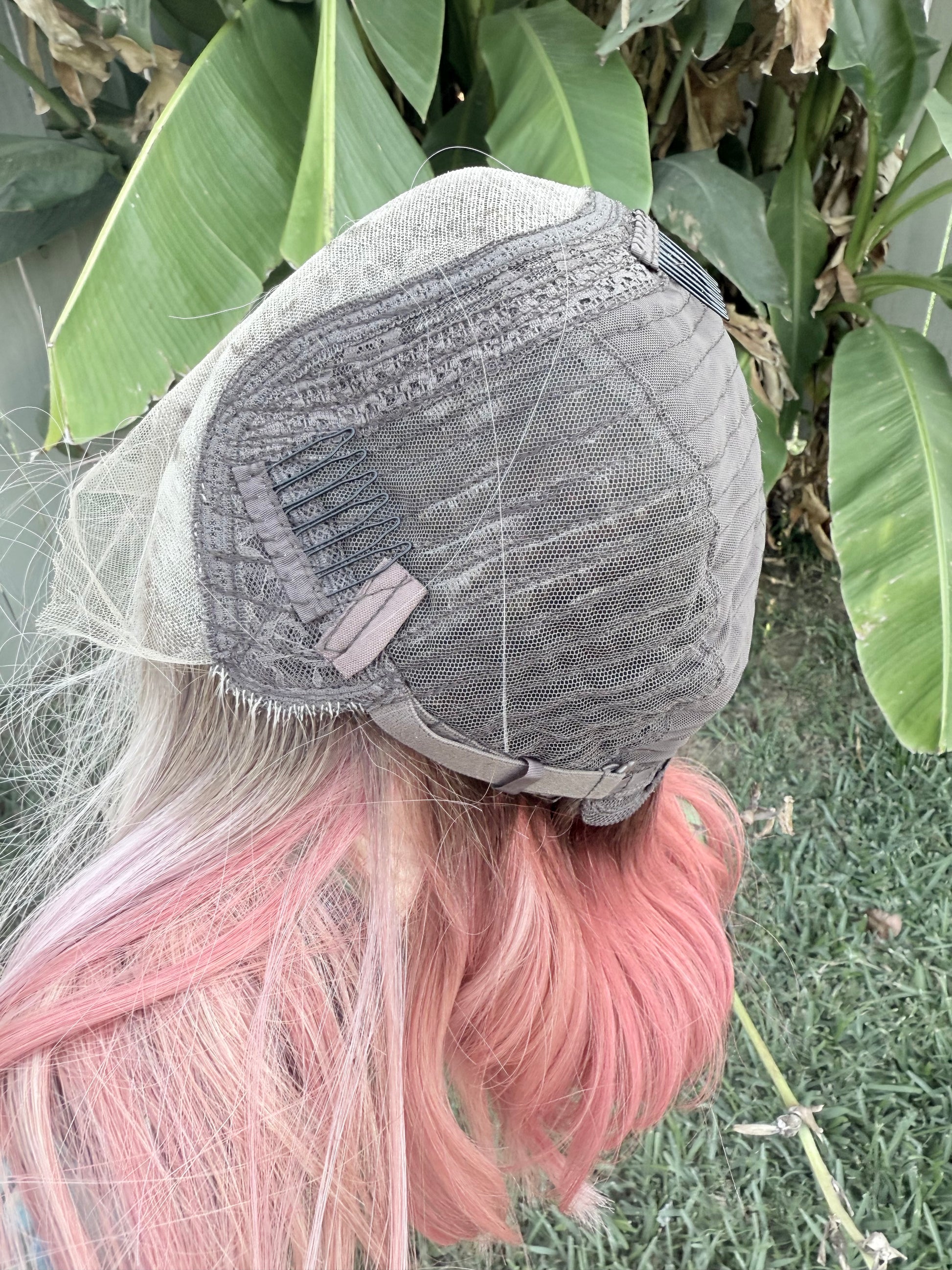 Lover is a mix of pinks, blonde and rose gold with dark blonde ash roots in a 14-15” lob. She has Slavic hair texture and is a single lace top.