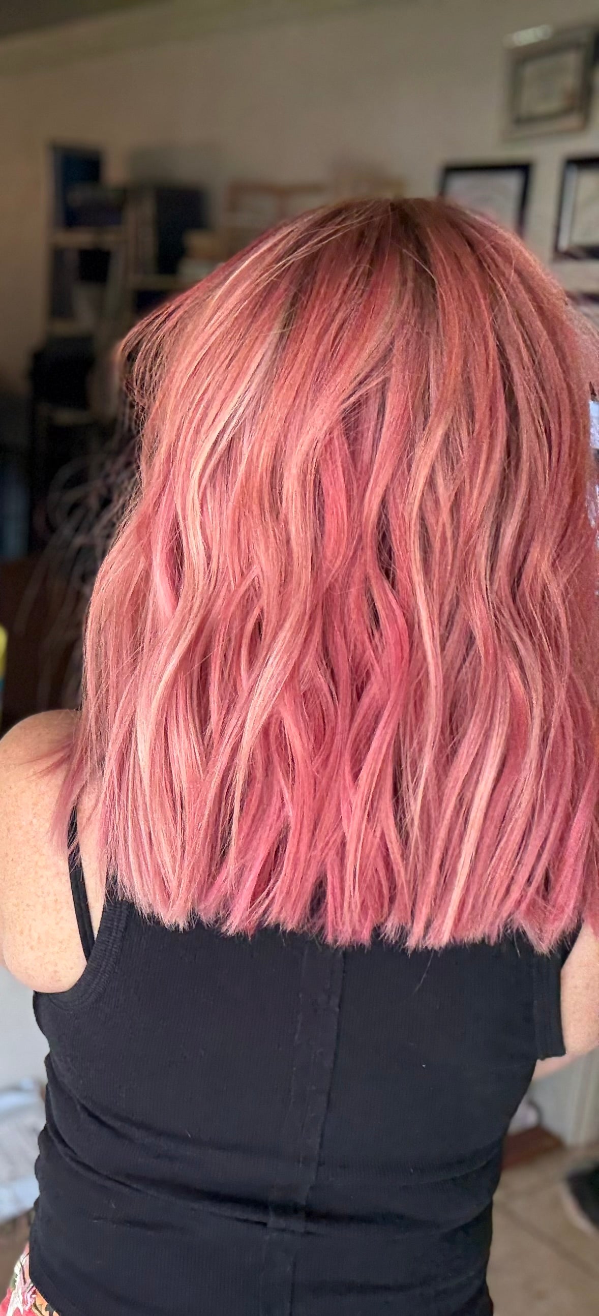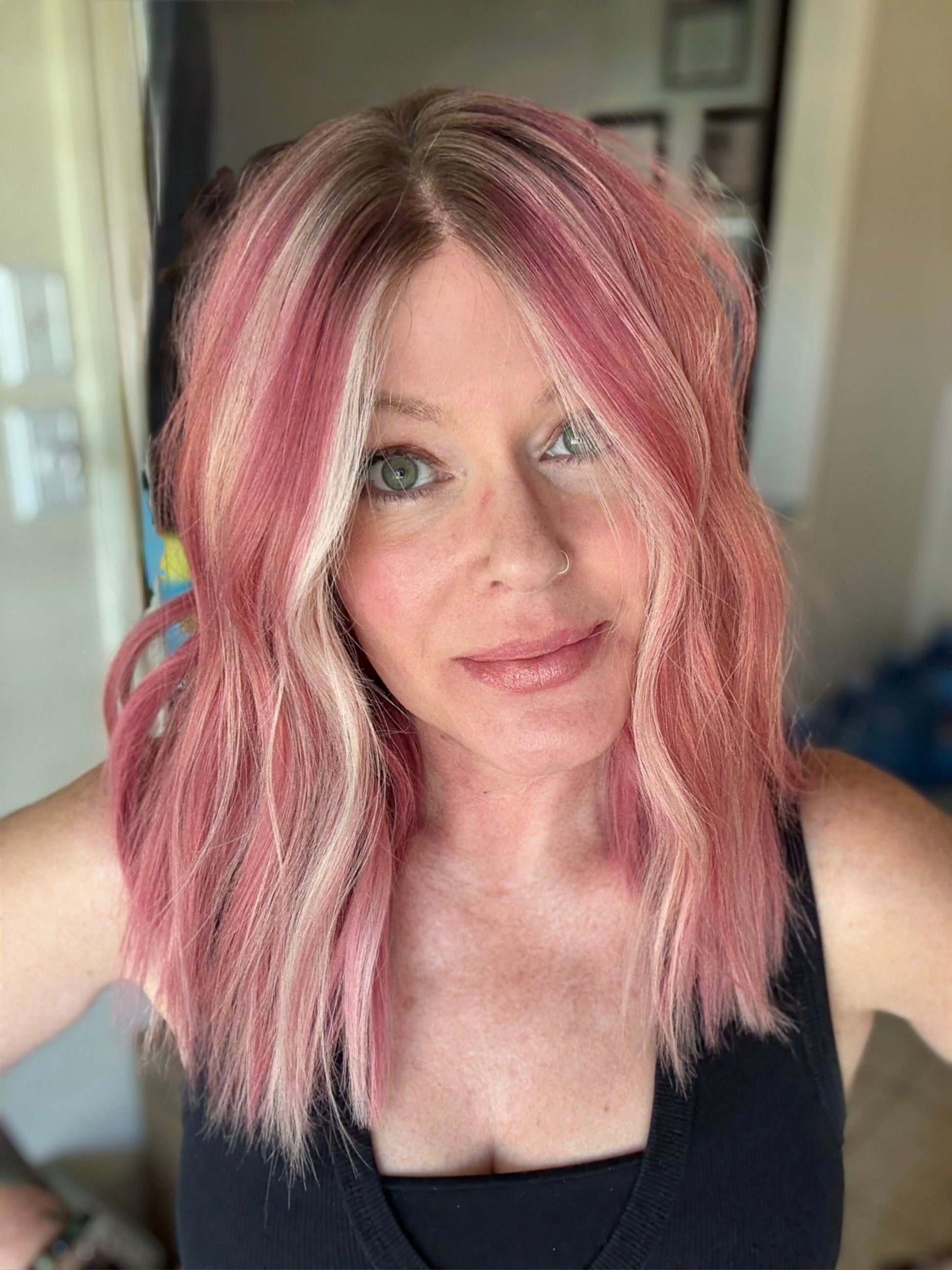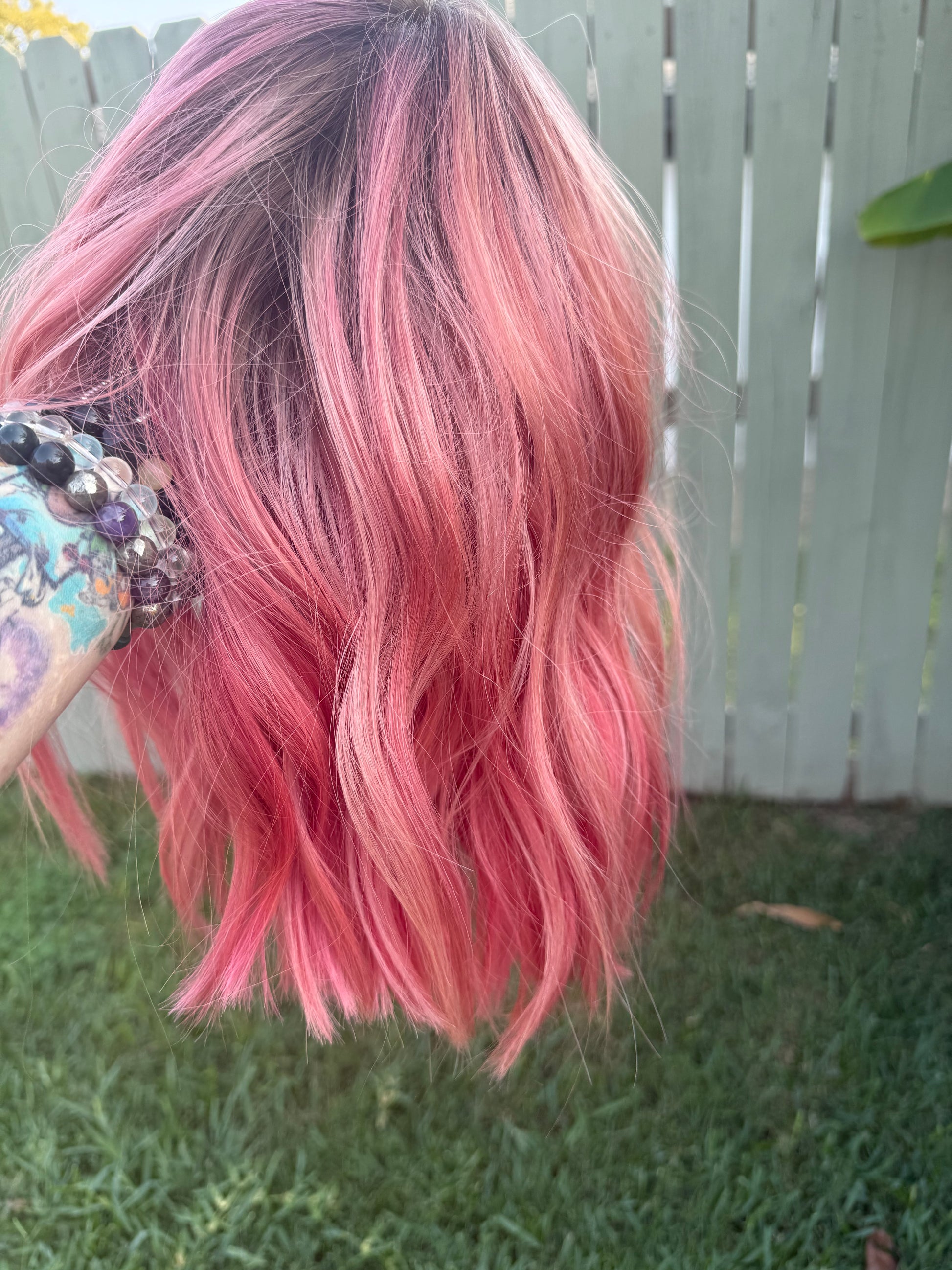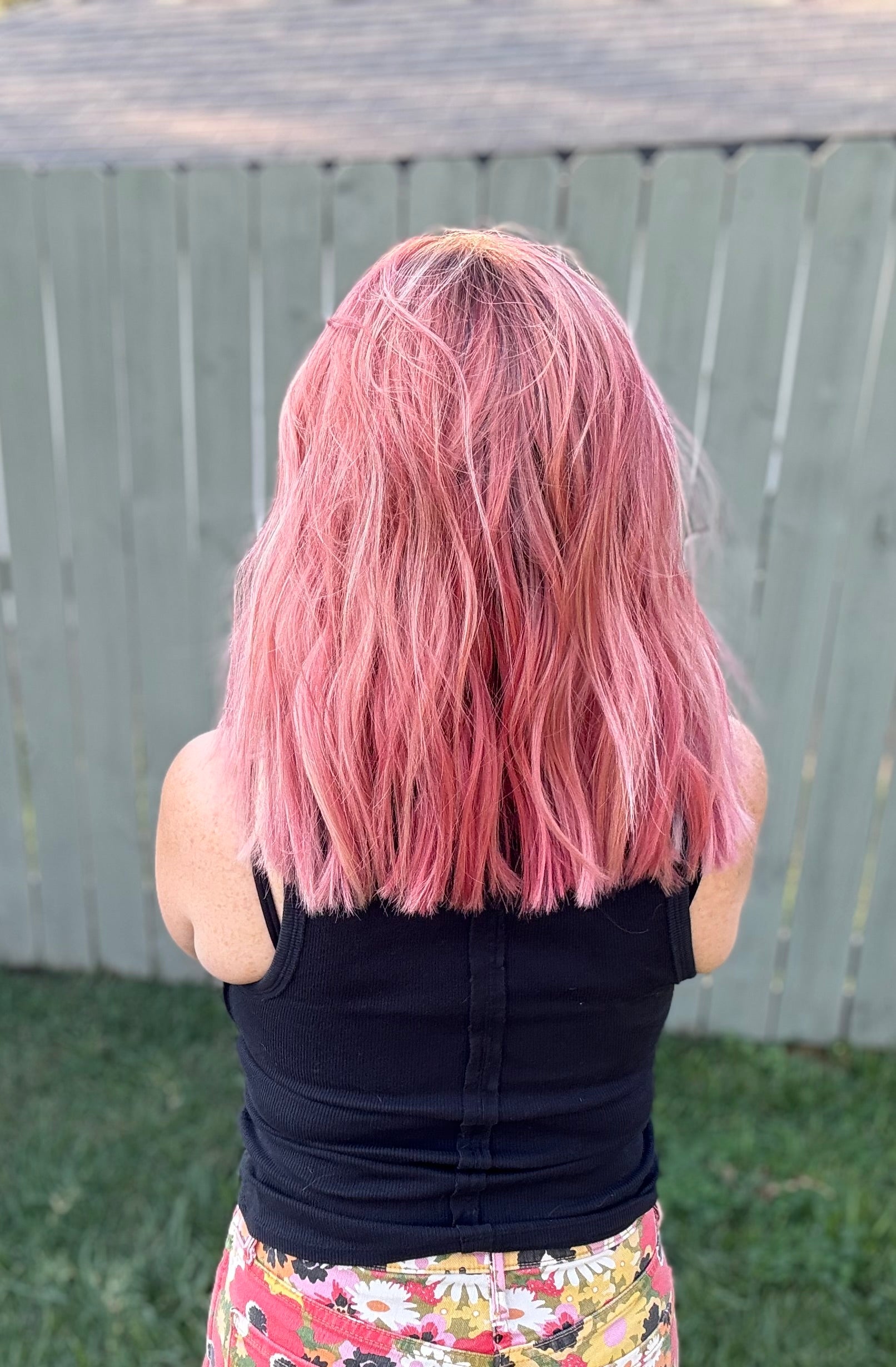 Lover is a mix of pinks, blonde and rose gold with dark blonde ash roots in a 14-15” lob. She has Slavic hair texture and is a single lace top.