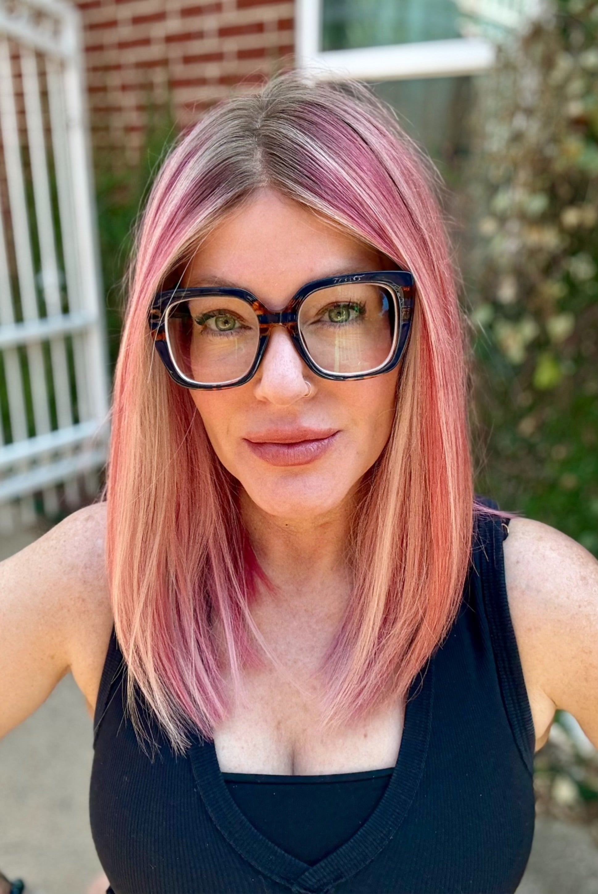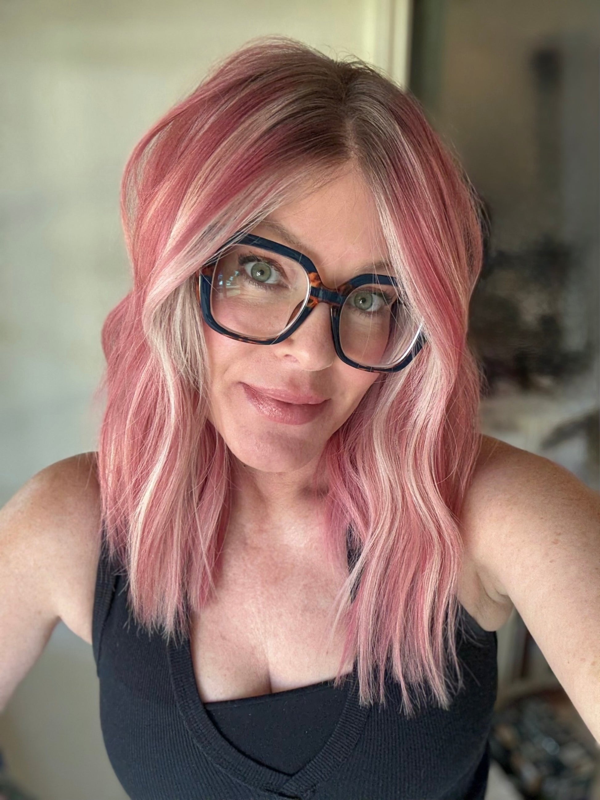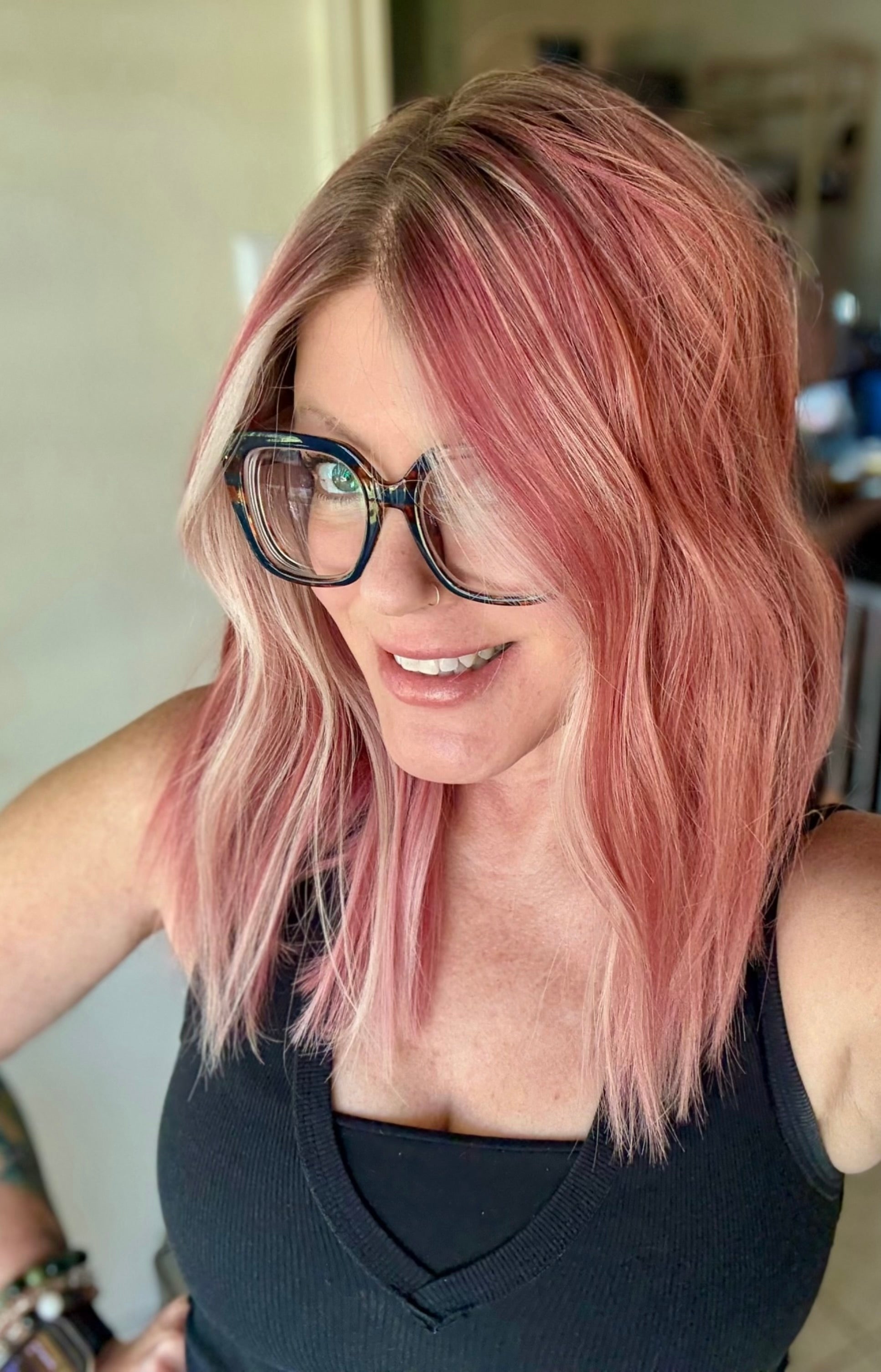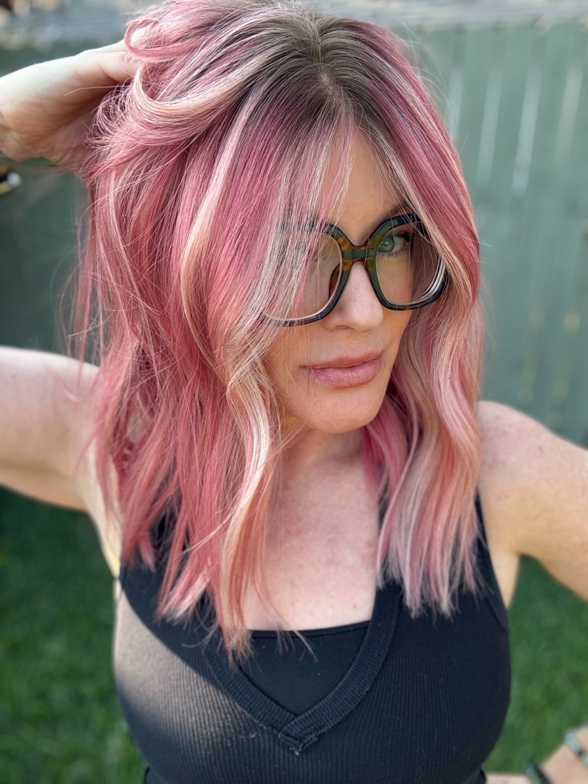 Lover is a mix of pinks, blonde and rose gold with dark blonde ash roots in a 14-15” lob. She has Slavic hair texture and is a single lace top.